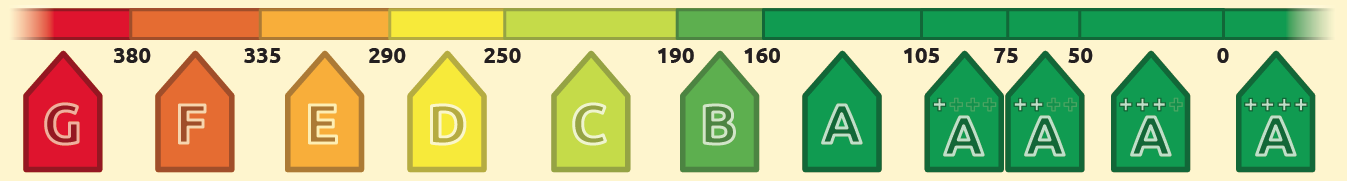 Schaalverdeling 'fossiele energie per jaar' tbv energielabels (kWh/m2)
